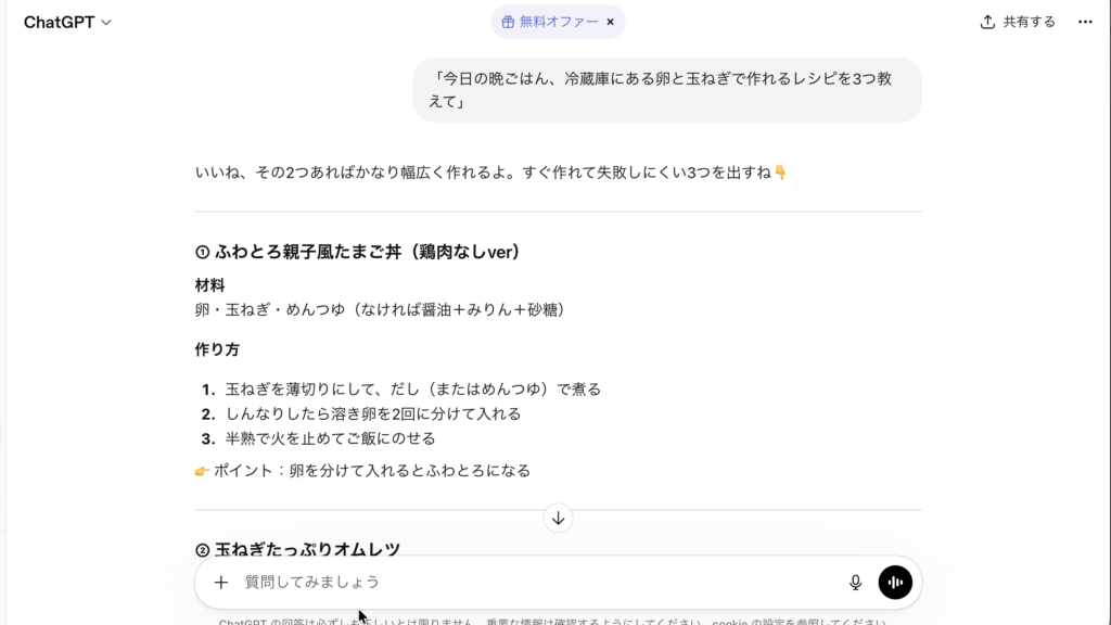 日常的な質問、文章作成、翻訳、アイデア出しなど、基本的な使い方は無料版でほとんどカバーできます。